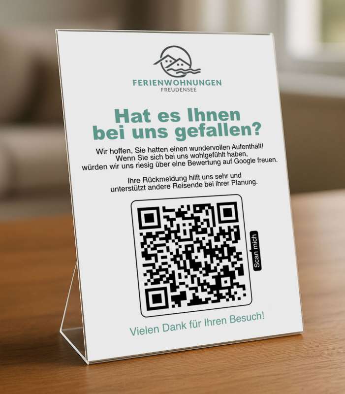 Ein starkes Ranking bei Google Maps ist für Ferienwohnungen und Hotels Gold wert. Der wichtigste Faktor dafür? Regelmäßige, frische Bewertungen. Mit unserer Vorlage animieren Sie Ihre Gäste bereits während des Aufenthalts dazu, Feedback zu hinterlassen – dezent, professionell und effektiv.
